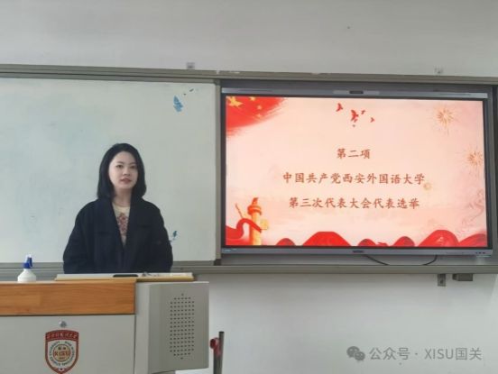 活动第二项,党支部组织开展中国共产党西安外国语大学第三次代表大会代表选举工作。党支部书记白鸽同志传达了学校《关于做好中国共产党西安外国语大学第三次代表大会代表选举工作的通知》的文件精神和要求。会议以无记名投票方式,推选出刘晗同志作为党员代表候选人推荐人选。白鸽书记对刘晗同志表示热烈祝贺,并希望当选代表珍惜全体党员的信任,认真履行代表职责,积极参与党代会各项议程,充分反映党员和师生的意见建议,圆满完成大会各项任务。